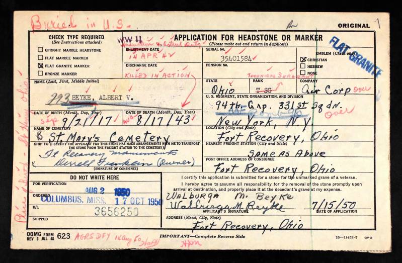 Born: 21 September 1917 Fort Recovery, Mercer County, Ohio