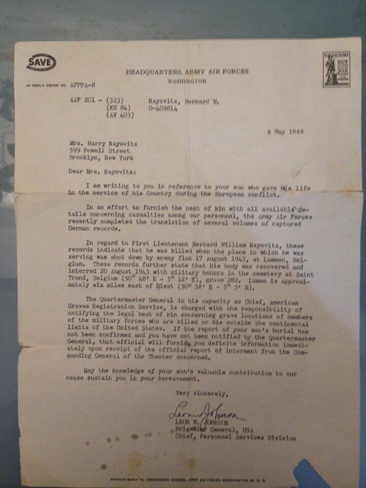 After the war, with secrecy lifted, the family learned that Bernie was buried near where his plane had crashed in Belgium.