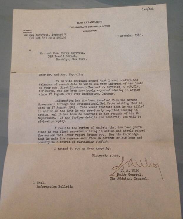“Dear Mom” had been shot down somewhere over Europe and Bernie was dead, as were five others of the 10-man crew. Two soldiers had been taken captive; two more escaped.