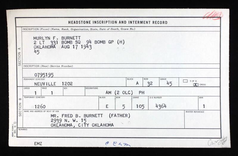 Entered the Service from: 19 jun 1941 Oklahoma He enlisted as a Private in the Army Air Corps on June 19, 1941, prior to the war, in Oklahoma City, Oklahoma. He was noted as being employed as a mechanic and also as Single, without dependents. Born: 28 March 1921 Oklahoma City, Oklahoma Hometown: Okfuskee County, Oklahoma Died: 17-Aug-43 |